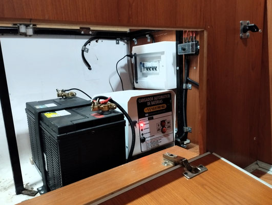 COLOCACIÓN E INSTALACIÓN DE CALEFÓN, TANQUE AGUAS GRISES, TAPA INGRESO AGUA TANQUE AGUAS BLANCAS, MEDIDOR DE TANQUES, BATERÍAS, CARGADOR DE BATERÍA, TÉRMICA Y DISYUNTOR, FUSIBLERA, TOMAS FICHAS 220 volts, CORTA CORRIENTE.